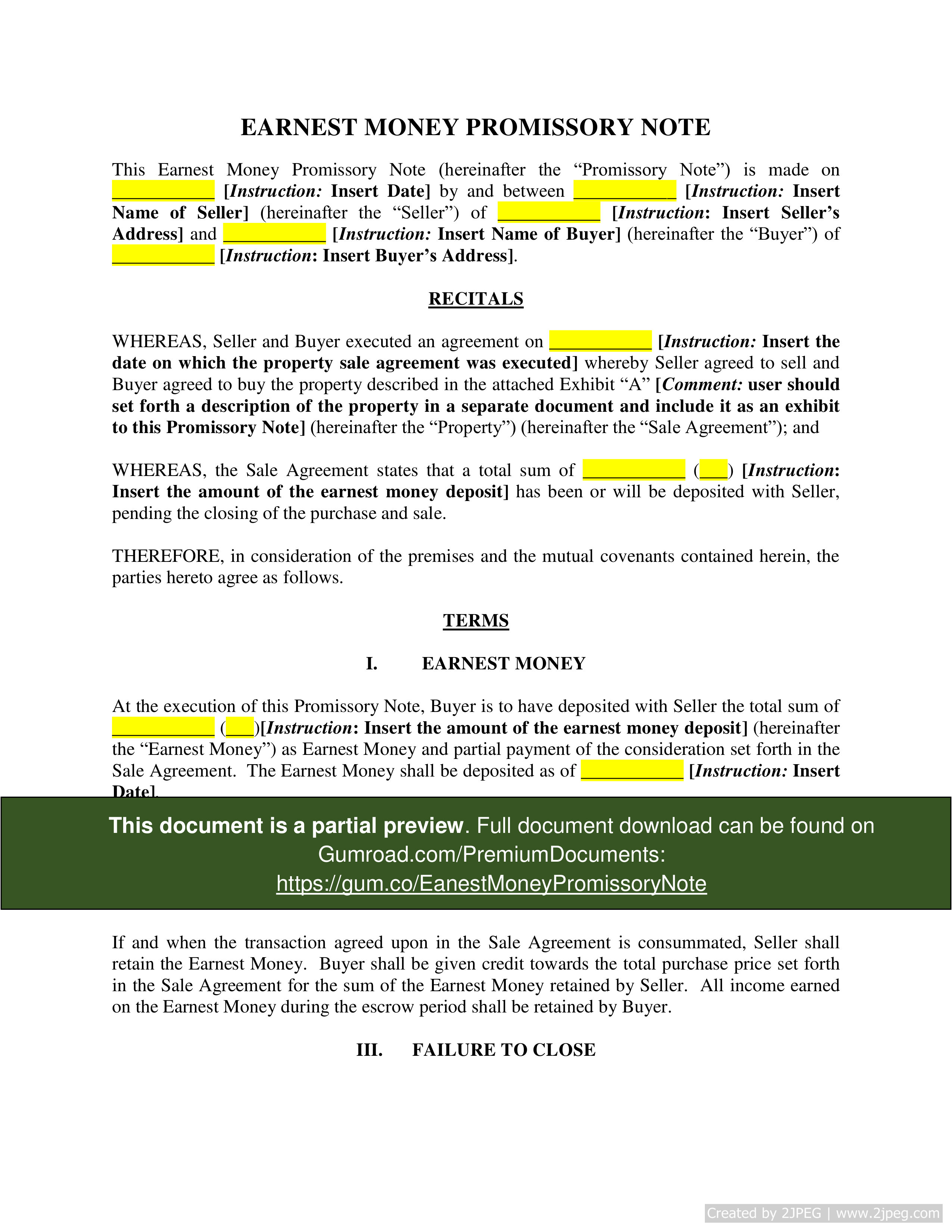 This Earnest Money Promissory Note is a form of security deposit made by a potential purchaser of real property to show that the he or she is serious about completing the transaction. When the transaction is finalized, the funds are put toward the purchase price. If the contract is terminated for any reason other than the purchasers breach, the deposit is returned to the purchaser. This document should be used by a purchaser and seller of real property when entering into a purchase agreement.